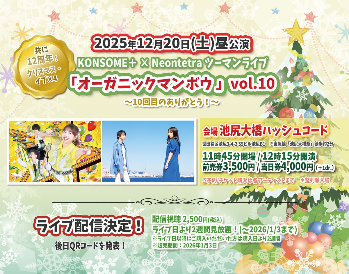 2025年12月20日(土)東京・池尻大橋ハッシュコードで開催されるライブの「紙チケット」です。NeontetraとKONSOME+とのツーマンライブです。本チケットをご購入頂いた方に、「特製ステッカー」「お手紙」を添えてお送りいたします。また、チケットにサインを入れることも可能です。(備考欄に記載ください)