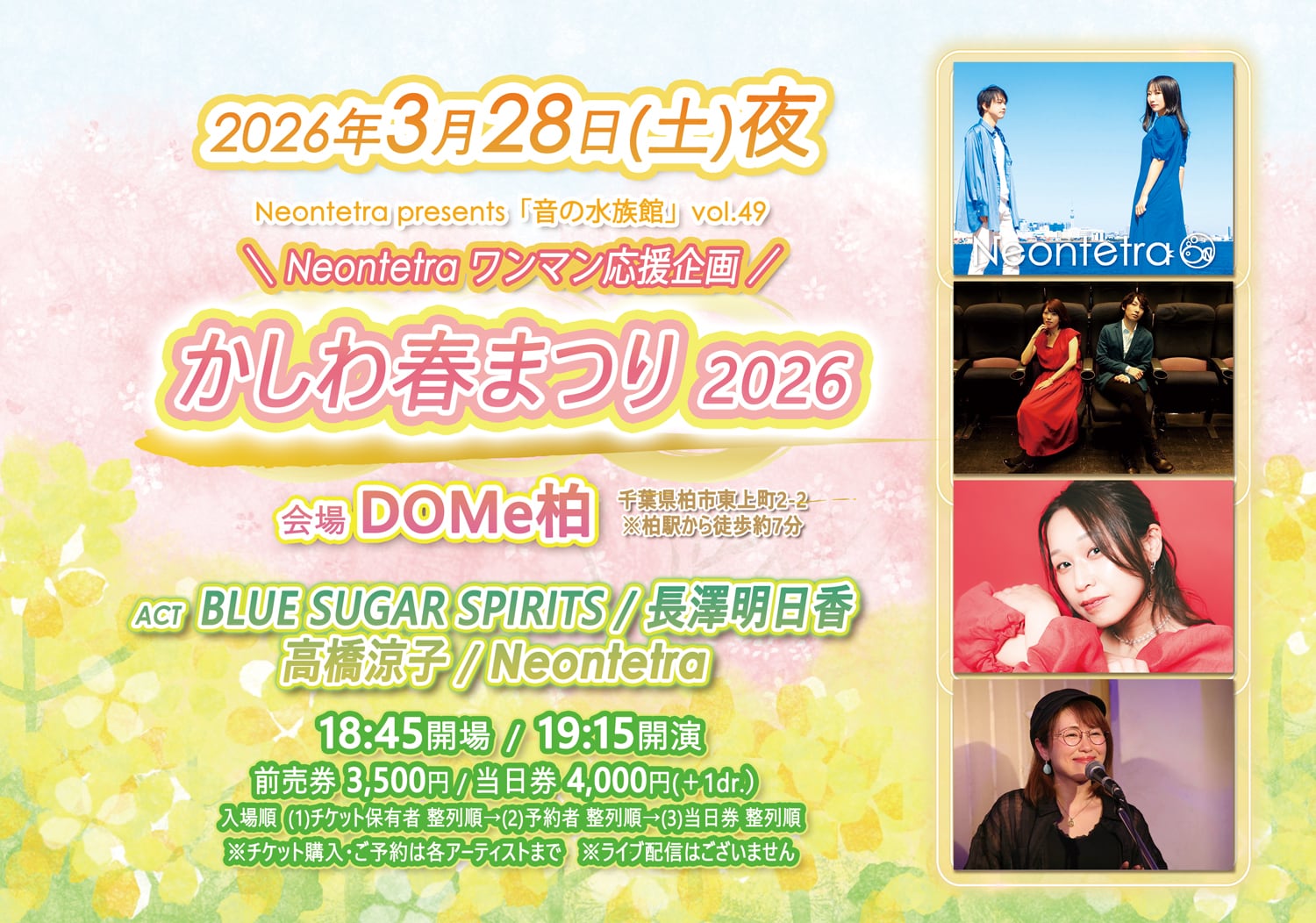 2026年3月28日(土)千葉県・DOMe柏で開催されるNeontetra主催ライブのの「紙チケット」です。